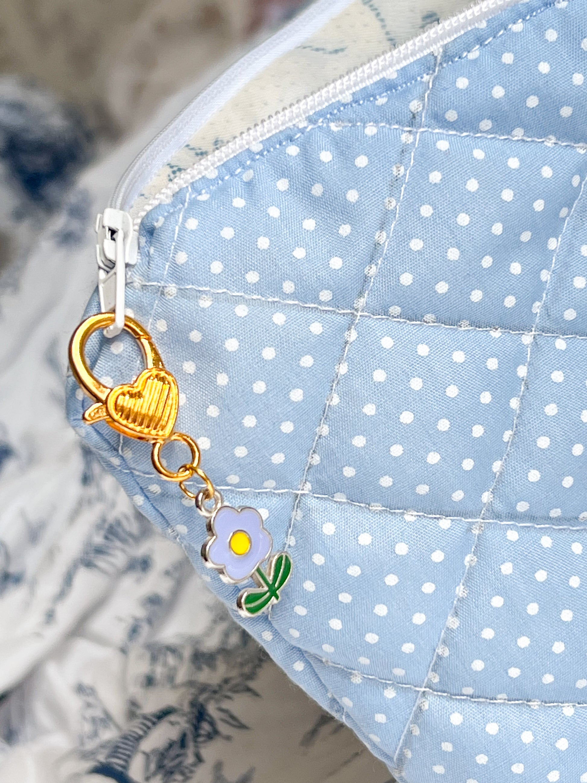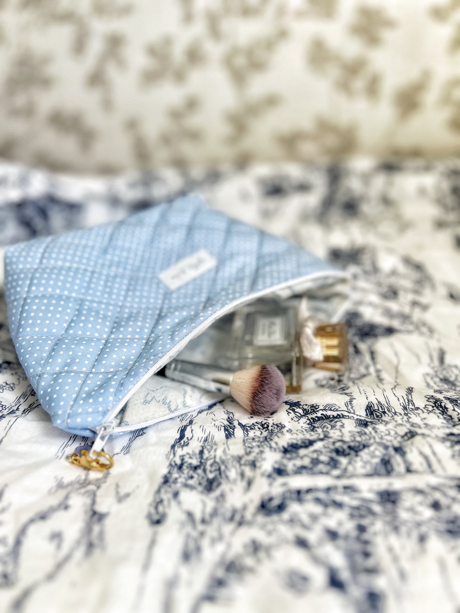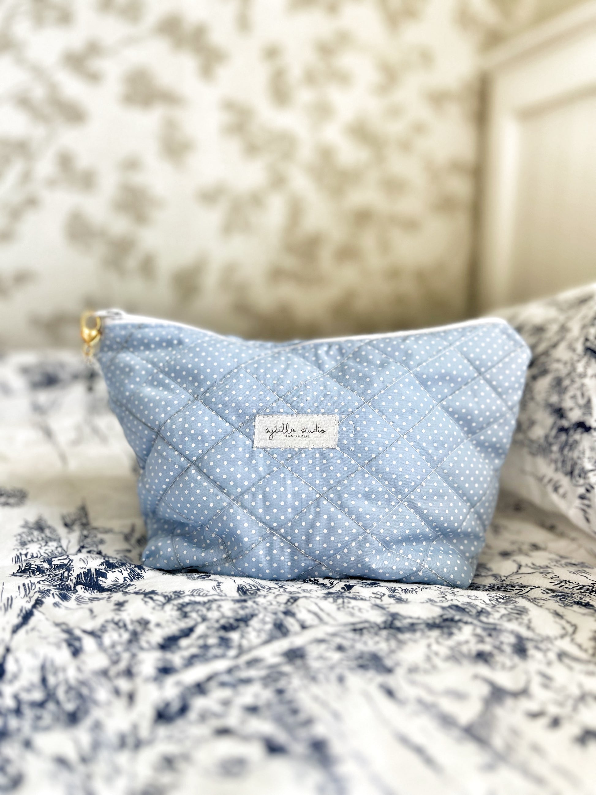 Delicado y encantador, este neceser acolchado y forrado hecho a mano, en tono celeste con sutiles puntitos combina ternura y estilo. Su diseño se complementa con un charm colgante en el cierre, un pequeño detalle que transforma lo cotidiano en algo especial. Perfecto para guardar tus esenciales con un toque de personalidad.