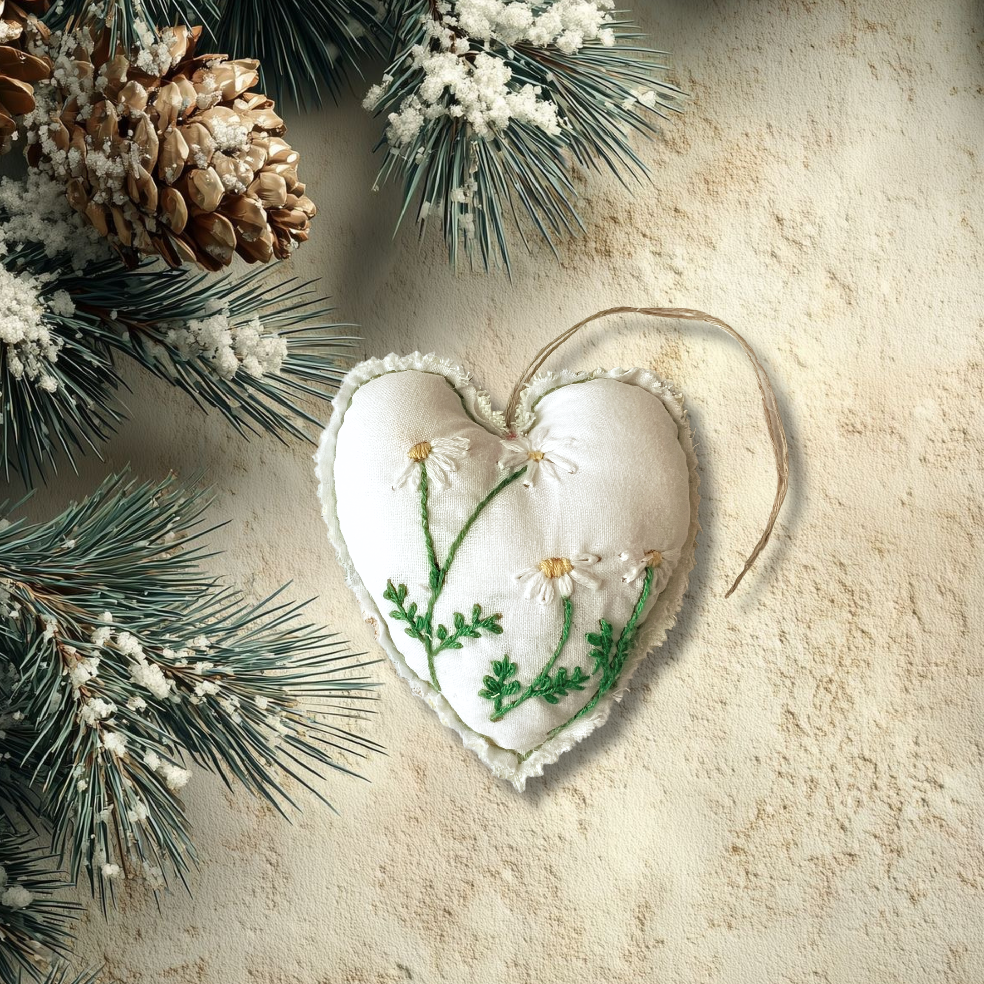Es un corazón de tela bordado y cosidos a mano, rellenos con fibras naturales suaves. Ideales para colgar en el árbol de Navidad, en puertas o en cualquier rincón que desees embellecer con un toque cálido y delicado.