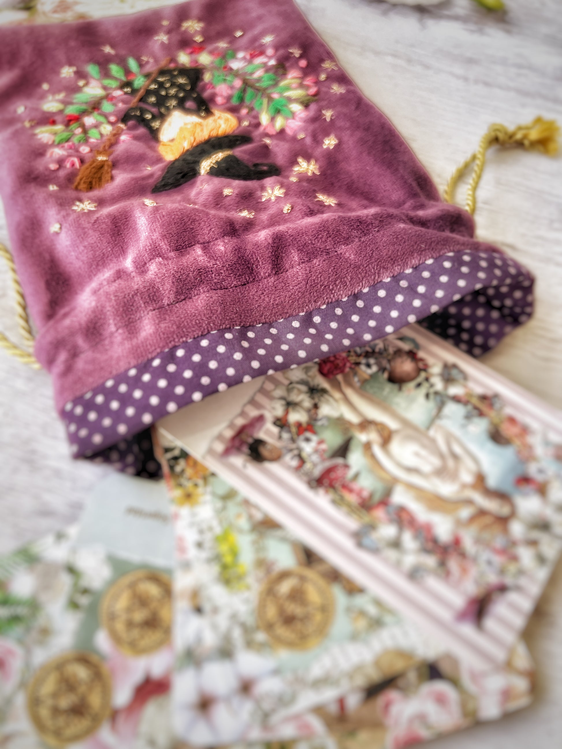 Bolsa de Tarot, en velvet color púrpura hecho y bordado a mano. Bolsa mágica hecha para cuidar tu baraja de oráculo o tarot.