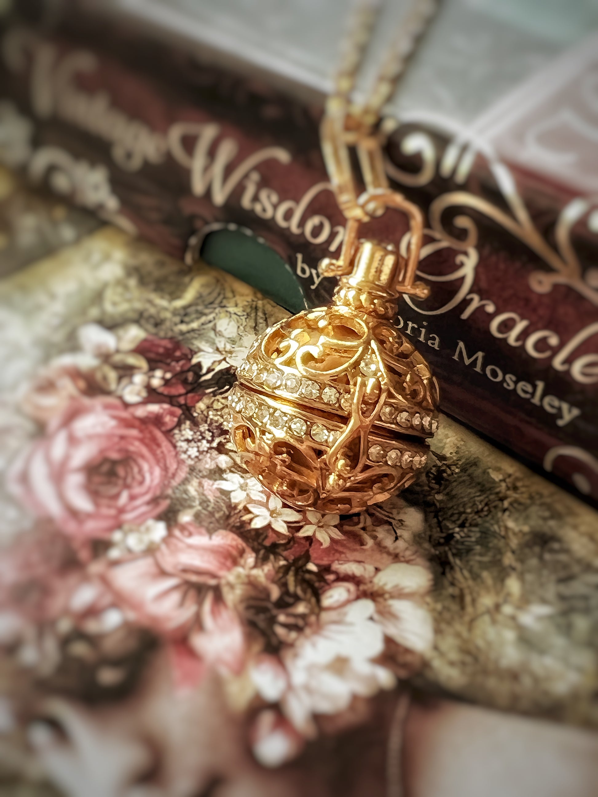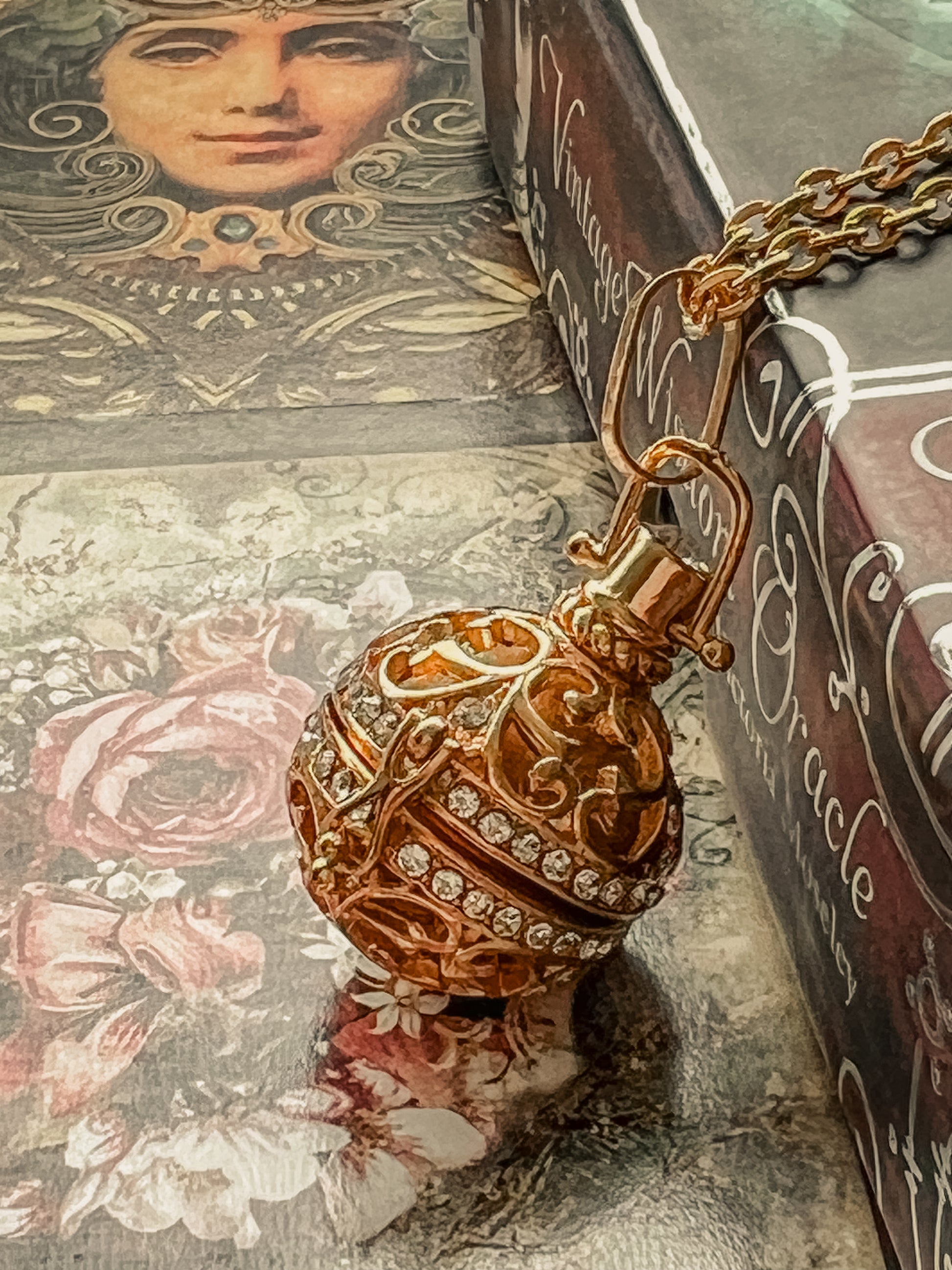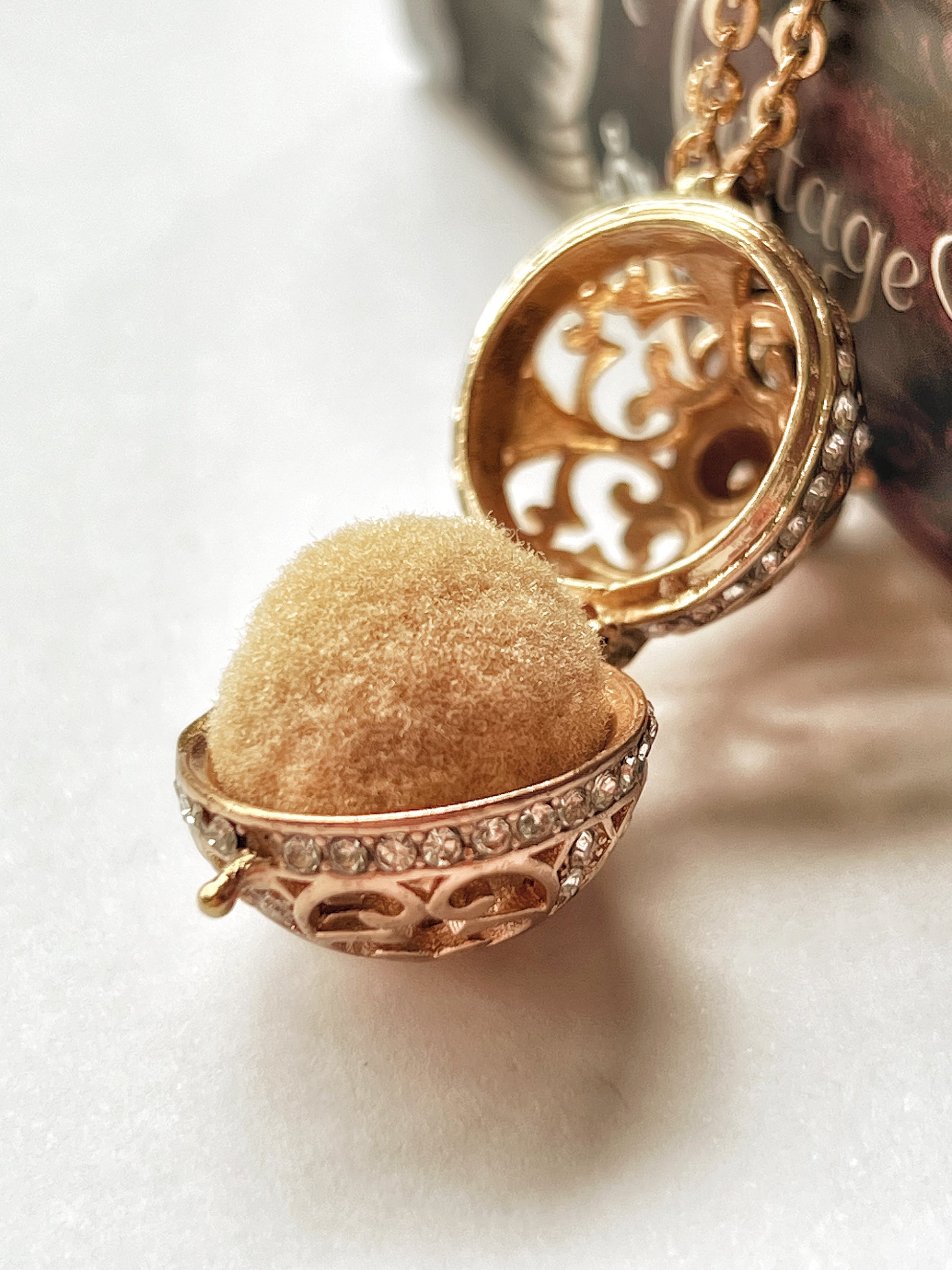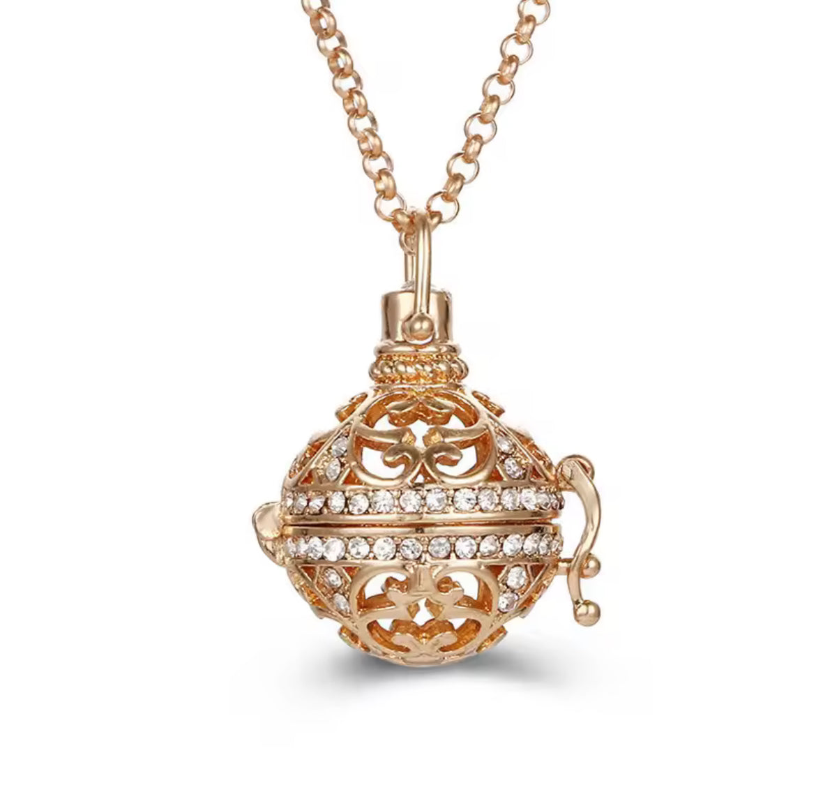 Un colgante dorado de estilo refinado, decorado con delicados brillantes que lo hacen brillar con elegancia. En su interior contiene una suave esfera de felpa, diseñada para impregnarla con tu perfume o esencia favorita, convirtiéndolo en un amuleto personal y aromático. Ideal para llevar contigo calma, intención y una fragancia que te acompañe durante el día.