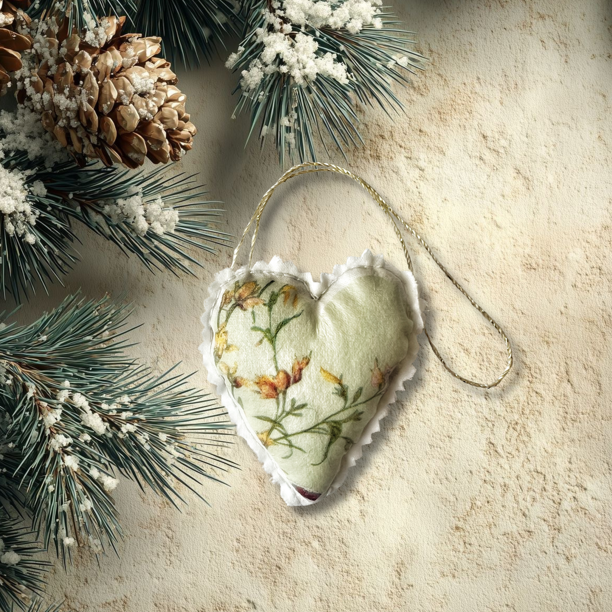 Corazón de tela con un suave aroma a lavanda ; relleno con fibra sostenible, cosido completamente a mano. “ Green Botanical” es un delicado corazón ideal para colgar en el arbolito de Navidad, puertas o cualquier rincón especial.
