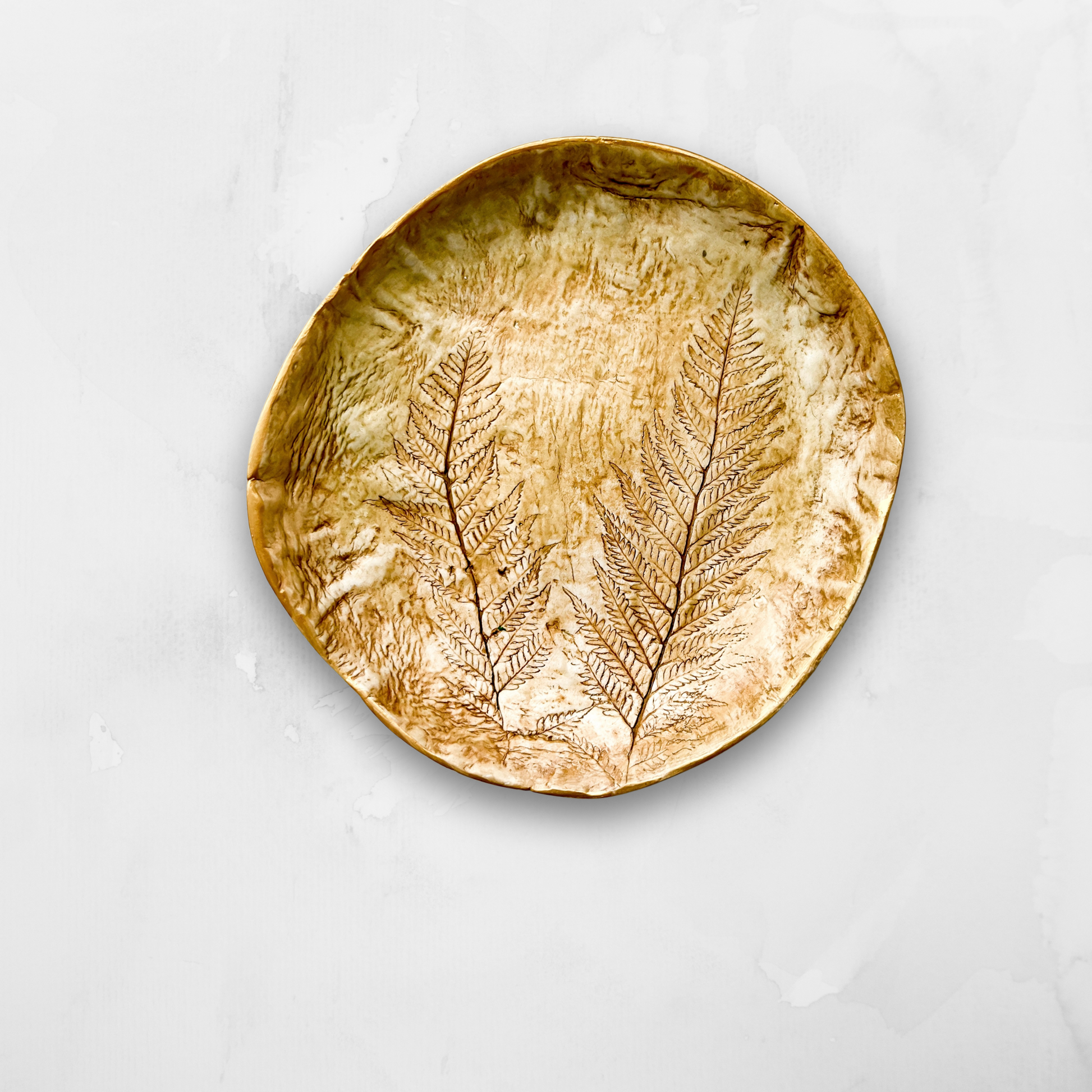 Un delicado platito modelado a mano en arcilla secada al aire, inspirado en la calma del bosque. Su superficie guarda en relieve invertido las hojas de un helecho, como si hubieran quedado impresas por la naturaleza misma.