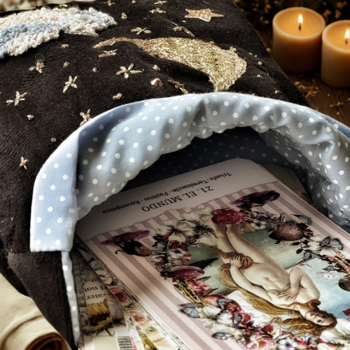 Gilded Noir Moon es un hermoso saquito de tarot hecho y bordado a mano por la Sybilla. Es una bolsa elegante y única, hecho de velvet negro y bordados dorados con aplicaciones.