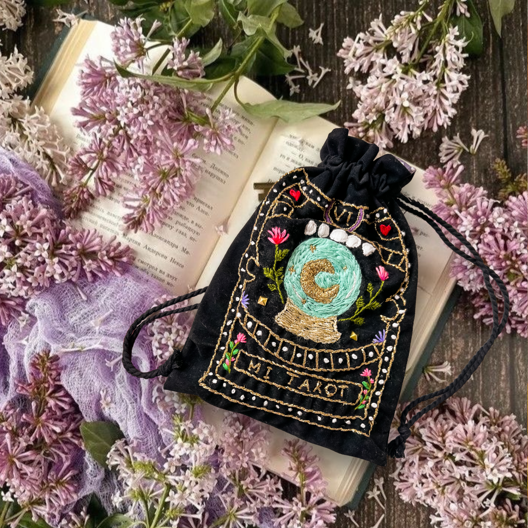 Saquito forrado de terciopelo negro bordado a mano “Mi Tarot” ideal para guardar y proteger tus cartas de Tarot. Medidas: 25x17 cm. Material mágico que envuelve tus cartas y las neutraliza para un nuevo uso.