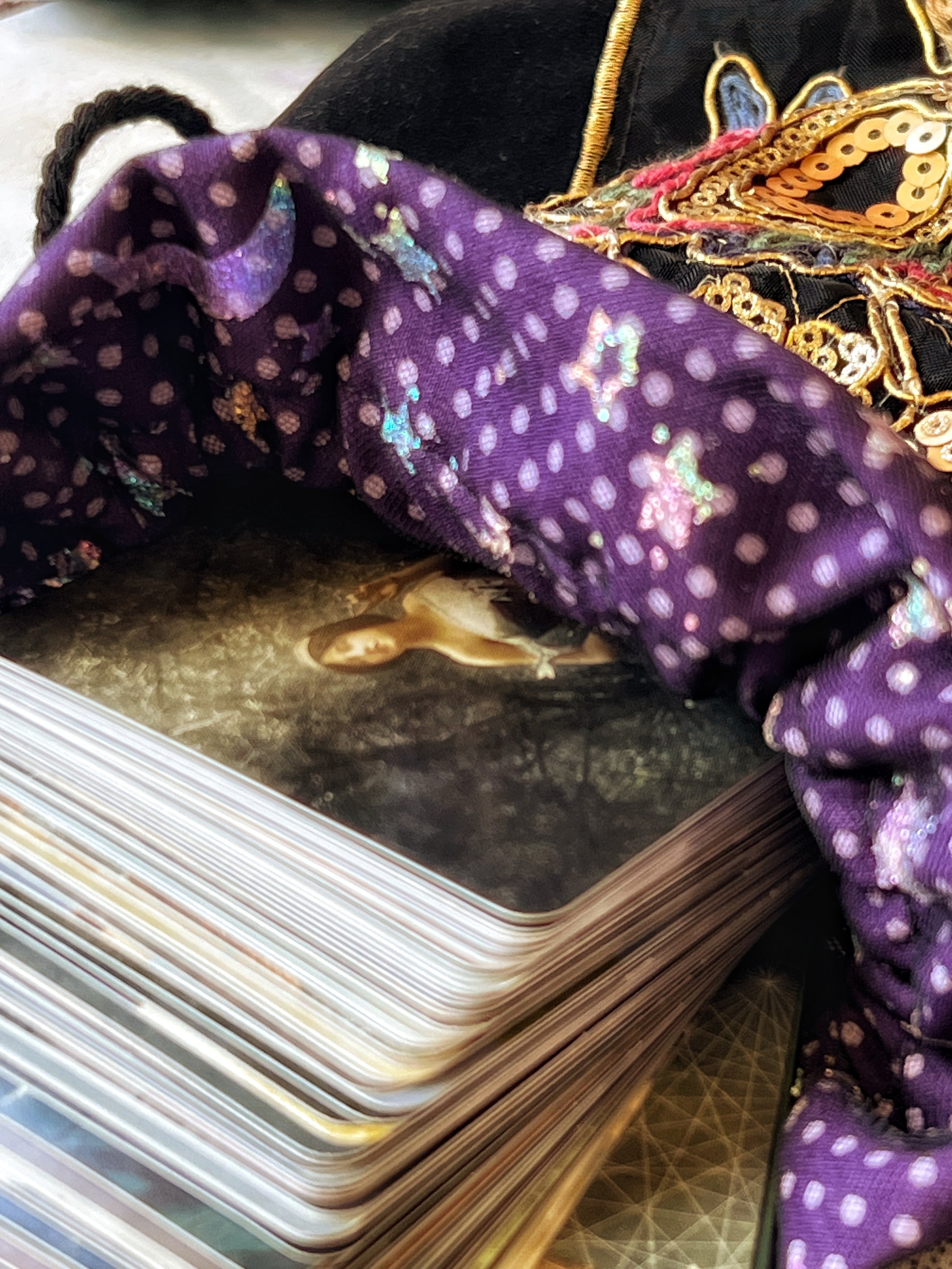 Saquito de terciopelo negro lujosamente decorado con aplicación de flores bordadas. Ideal para guardar cartas de Tarot con elegancia, misterio y magia. Saquito forrado.