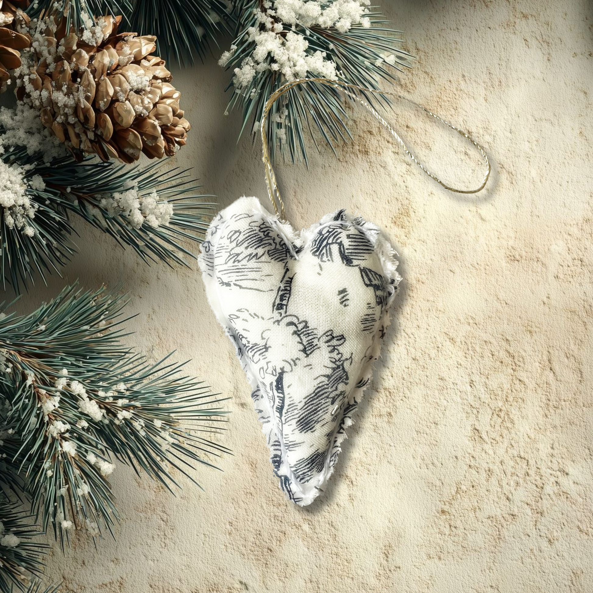 Corazón hecho a mano, relleno de fibras naturales y creado al estilo victoriano. Un detalle ideal para tu árbol o para dar encanto a cualquier espacio.